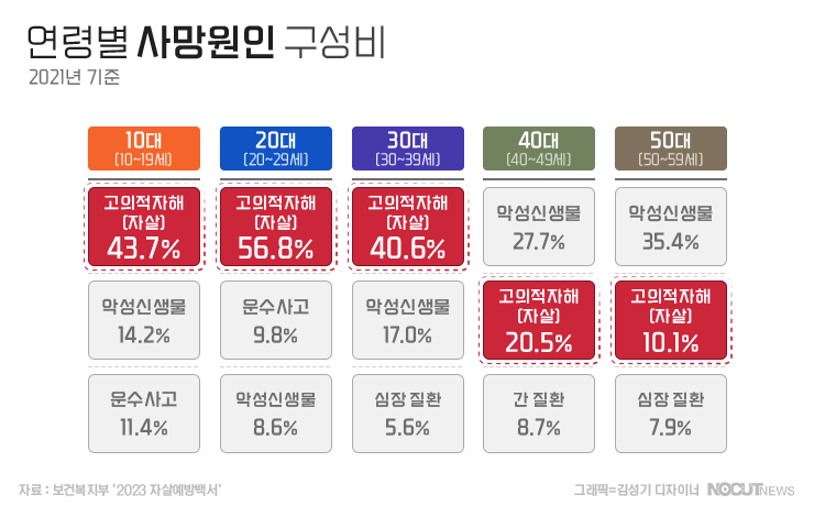 더구나 10대부터 30대의 사망원인 1위가 사고나 질환이 아닌 자살입니다. 5대 사망원인 중 자살 비중이 10대 43.7%, 20대 56.8%, 30대 40.6%으로 10명 중 4명 이상 자살사망자입니다.