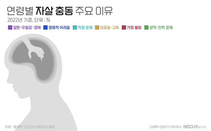 자살 유발 요인은 정신적, 경제적, 학업, 직장, 취업, 가정환경, 질환 등 다양한 원인이 있습니다. 2022년 사회조사 결과에 따르면 자살 충동 이유는 질환·우울감·장애(35.4%), 경제적 어려움(27.6%), 직장문제(11.1%), 가정불화(8.9%), 외로움·고독(8.0%) 순이었고 남자는 경제적 어려움, 여자는 질환·우울감·장애가 주된 이유였습니다. 10~30대 및 60세 이상은 질환·우울감·장애, 40·50대는 경제적 어려움을 가장 많이 꼽았습니다.