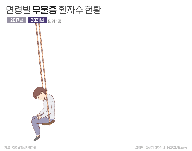 우울증 환자 증가는 통계로도 확인됩니다. 지난해 6월 건강보험심사평가원이 발표한 '우울증 진료환자 통계'를 보면, 2021년 우울증 진료환자는 93만 3481명으로 2017년에 비해 35.1% 늘었습니다. 2017년에는 60대 환자가 전체의 18.7%로 가장 큰 비중을 차지했으나, 2021년에는 20대 환자가 전체의 19.0%로 가장 많았습니다. 2017년과 비교해 연령대별 환자 증가 폭은 20대 127.1%, 10대 90.2%, 10대 미만 70.2%, 30대 67.3% 순으로 컸습니다.