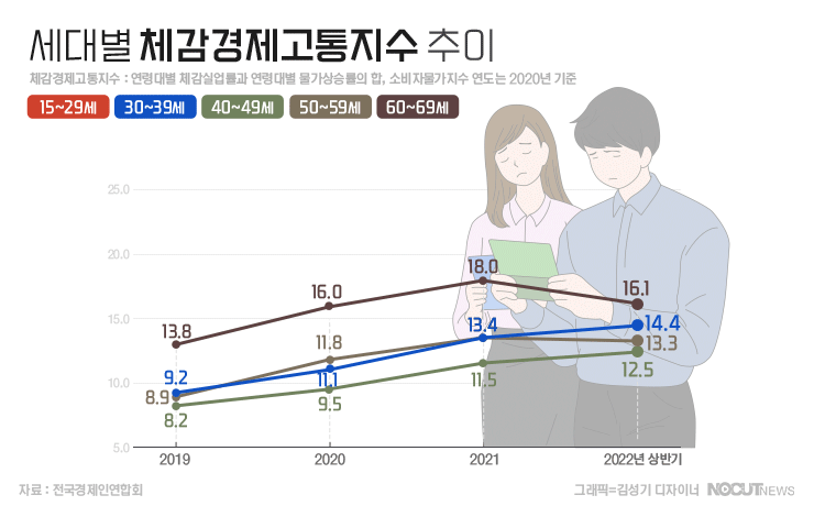 '경제고통지수'란 미국 경제학자 오쿤(Arthur Okun)이 국민의 경제적 삶의 질을 측정하기 위해 고안한 지수로 실업률과 물가상승률을 합해 산출합니다. 세대별 체감 경제고통지수는 연령대별 체감실업률과 연령대별 물가상승률을 더해서 도출합니다.