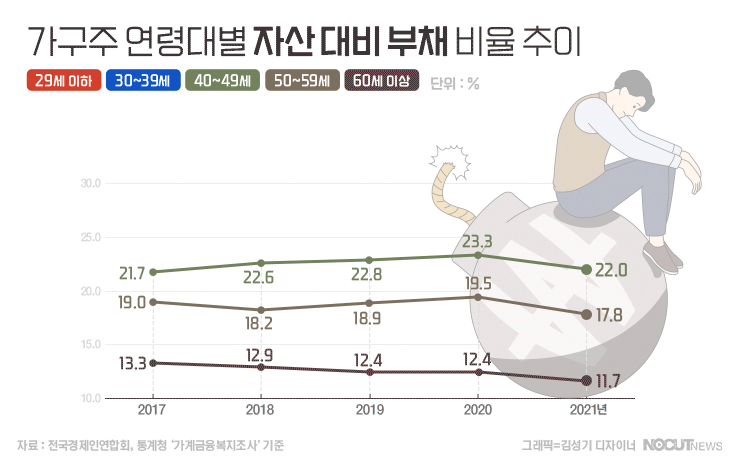 청년층 가구주의 자산 대비 부채 비율은 2017년을 기점으로 지속적으로 상승하여, 2020년에는 32.5%까지 증가했다가 2021년 29.2%로 감소했지만 전 연령대 중 가장 높은 수준입니다. 이는 다른 연령대주와 비교하여 청년층의 부채 증가속도가 자산 증가속도보다 월등하게 빠르기 때문입니다.