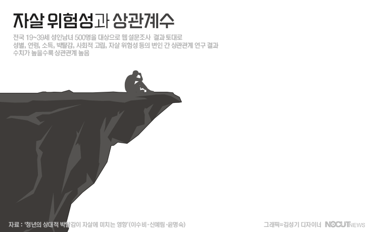 그 결과 자살 위험성과의 상관계수(높을수록 상관관계 높음)는 여성(0.117), 직업이 없음(0.180), 가구 소득 낮음(0.172), 부정적인 미래 전망(0.249), 사회적 고립감(0.309)과 함께 상대적 박탈감(0.291)에서 높게 나타났습니다.