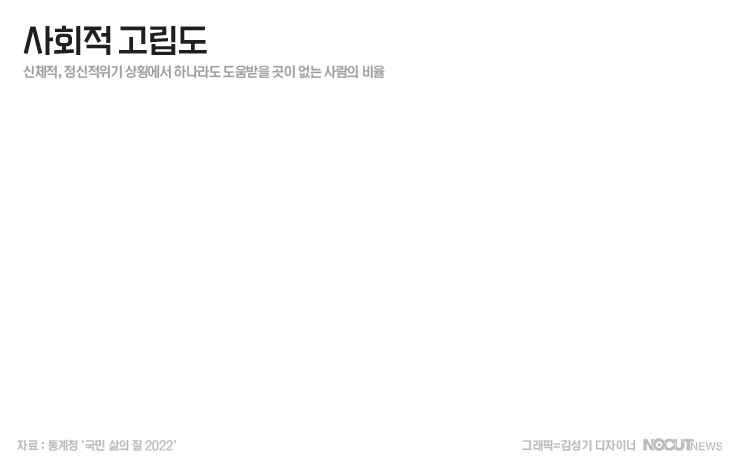 신체적·정신적 위기 상황에서 도움받을 곳이 없는 사람의 비율을 의미하는 '사회적 고립도'는 2021년 34.1%로 2019년에 비해 6.4% 증가했습니다. 연령이 높아질수록 사회적 고립도가 증가하지만 20·30대 청년층의 고립도가 26.7%, 27.9%나 됩니다.