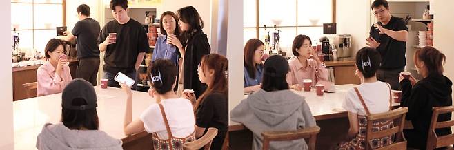 <주식회사 컬쳐히어로 요청으로 진행한 ‘찾아가는 유명카페’ 현장: 커피에 대한 의견을 나누는 컬쳐히어로 구성원들(왼쪽)과 커피에 대해 소개하는 원두데일리 엔지니어 제임스(James)>