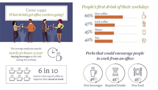 원폴은 미국 직장인 2천명에게 ‘직장에서 마시는 음료’에 대한 질문을 던졌다. 응답자 60%가 업무 도중 기분 전환을 위해 커피를 마신다고 응답했다. 하루에 필요한 커피양을 묻는 질문에는 77%가 2잔 이상이라고 답했다. 또한, ‘평소에 그날 처음으로 마시는 음료’를 묻는 질문에 뜨거운 커피라고 답한 사람이 무려 66%에 달했다. 아이스커피도 47%에 이르렀다. 45%를 기록한 물보다도 높은 비율이다. 직원들의 동기 부여를 위해 회사에서 줄 수 있는 가장 매력적인 특전으로는 46%가 무료로 제공하는 음료라고 답했다.