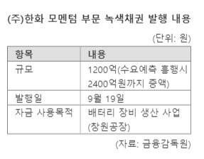 10일 관련업계에 따르면 산업기계 분야인 (주)한화 모멘텀 부문은 오는 19일 목표로 1200억원 규모의 녹색채권을 발행키로 하고 11일 수요예측을 진행한다. 수요예측 결과에 따라 최대 2400억원까지 발행규모를 늘릴 예정이다.