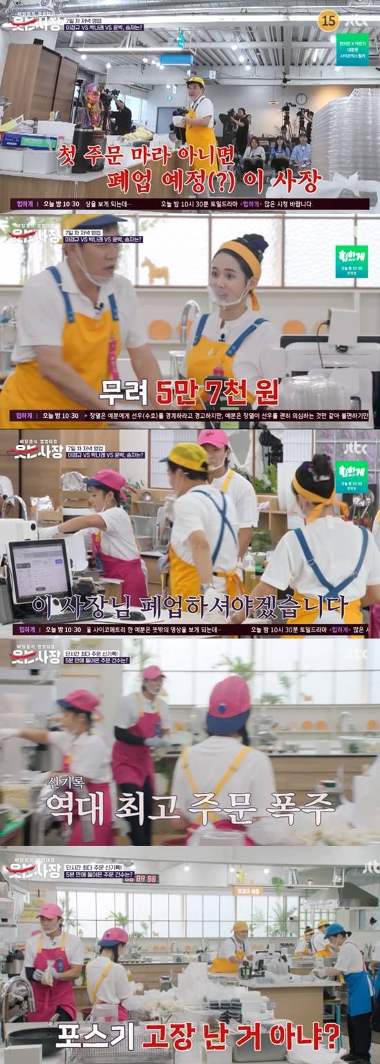 이날 이경규, 박나래, 윤박 식당은 7일 차 영업을 앞두고 호기롭게 '파이팅'을 외쳤다. 자신감에 넘친 이경규는 "제일 처음 우리 주문이 들어오지 않으면 바로 폐업하겠다"고 선언했다.