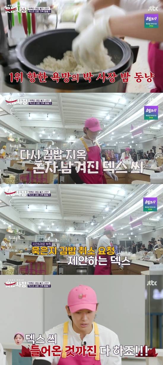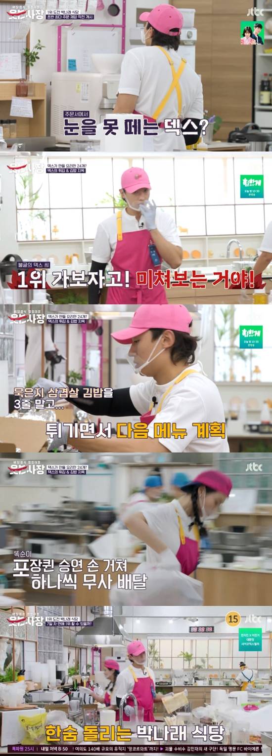 하지만 덱스는 이후 묵은지 삼겹살 김밥 주문이 너무 많이 들어오자, 한숨을 푹푹 쉬었다. 급기야 밥을 다 써서 밥이 없는 상태. 그는 "삼겹살 김밥 안 팔아야 한다. 튀김으로 돈 벌면 된다"고 박나래 사장에 어필했다.