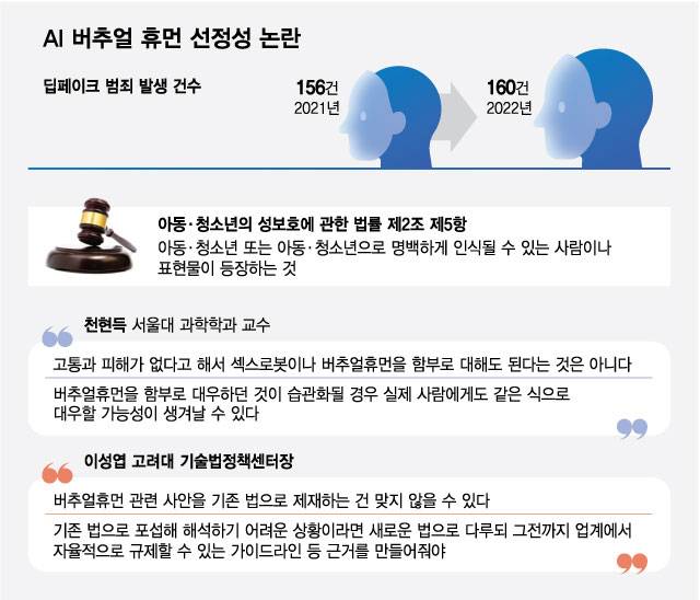실제 인간이 아니라는 이유로 버추얼휴먼을 음란물의 대상으로 삼지만, 일부 영상은 현행법에 따라 아동·청소년 '성착취물'로 분류될 수 있다. 비단 법에 저촉되는 영상이 아니더라도, 버추얼 휴먼에 대한 '성적 학대'가 지속된다면 현실에서의 인간 관계에도 왜곡된 관점이 반영될 수 있어 주의가 필요하다.