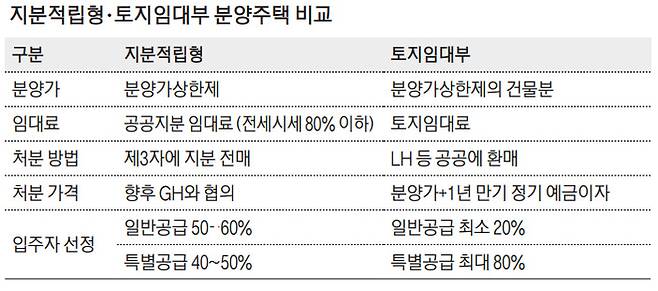 내 집 마련을 위한 초기 투자금이 크게 줄어 서울주택도시공사(SH)의 ‘토지임대부주택’과 함께 ‘반값 아파트’로 불리기도 한다. 하지만 건물만 소유할 수 있는 토지임대부와 달리 땅과 건물을 모두 가질 수 있고, 공공기관에만 환매가 가능한 토지임대부주택과 달리 전매제한기간이 끝나면 개인 거래를 할 수 있다는 부분은 상대적 장점이다.