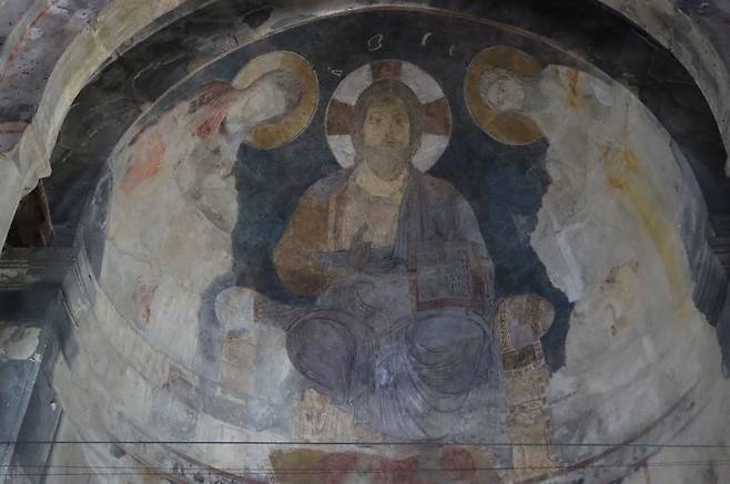 그 아래로 또 다시 인물들이 그려져 있는데, 세 사람을 제외한 나머지는 훼손되었다. 이 벽화는 원래 13세기에 그려진 것이다. 그런데 훼손이 심해 2018년 출리얀(Sepouh Chuliyan) 대주교의 지도하에 현재의 모습으로 복원되었다. 제대 앞 서쪽의 벽면에는 최근에 그려진 성모자상이 걸려 있다.