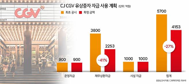 무엇보다 CJ CGV는 유상증자 최초 공시 이후 주가가 하락해 조달 금액도 27%가량 축소됐다. 기존에 5700억원의 자본확충을 기대했으나 실제론 4153억원으로 감소했다. 자금 사용 우선순위를 고려해 채무 상환에 투입할 금액을 41%가량 조정했다. 부족분은 자체 현금을 활용한다는 계획이다.