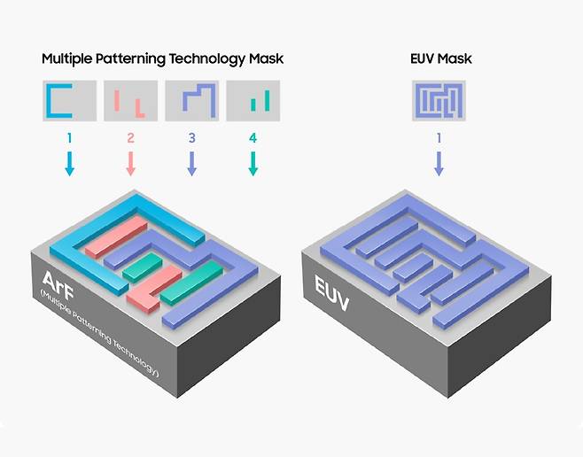 | ▲ DUV와 EUV의 공정 진행 방식 차이. EUV는 한 레이어를 한번의 작업으로 끝낼 수가 있습니다. |