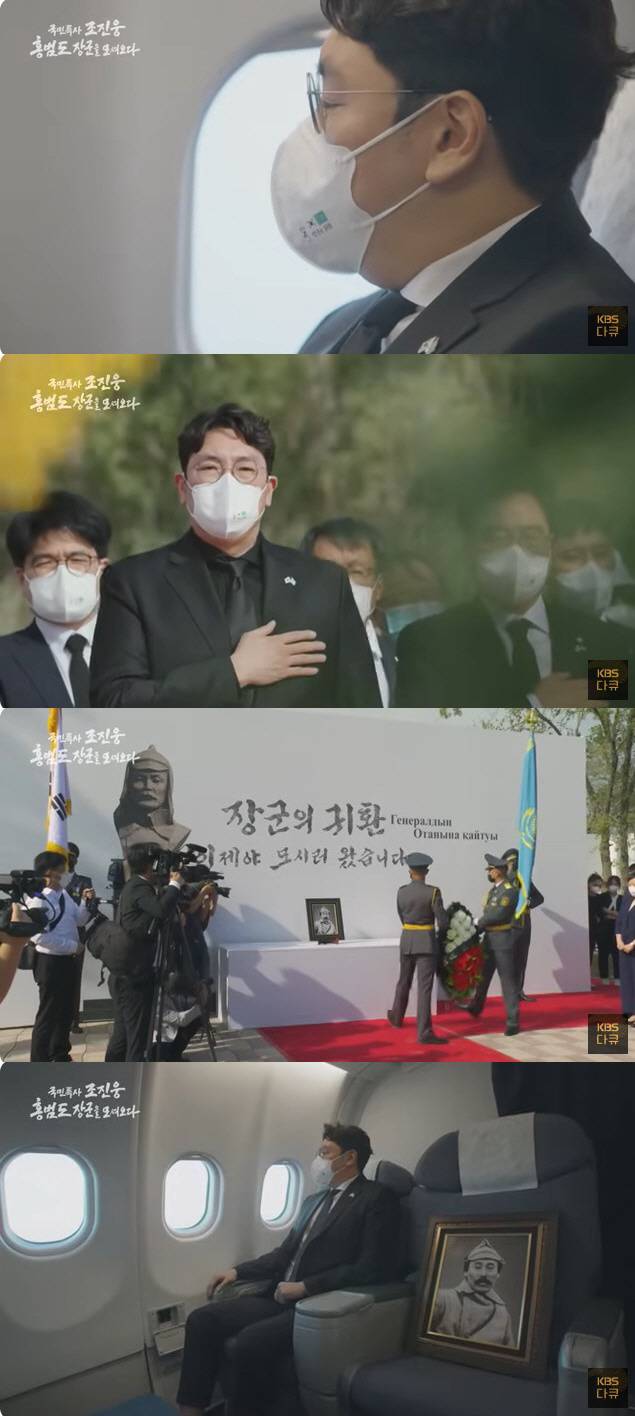 조진웅은 '대장 김창수', '암살' 등의 영화에서 독립투사로 출연했고 홍범도 장군 유해 국내 봉환 과정을 국민특사 자격으로 함께한 연예계 대표 애국 스타다. 카자흐스탄으로 가 홍범도 장군의 유해를 직접 모신 조진웅은 "면목이 없고 많이 늦었다고 생각되는데 그래도 이렇게 모실 수 있어 영광"이라 밝혔다. 이후 조진웅은 국내에서 이어진 안장식에도 참석, "장군님의 흔적과 그 흔적을 기억하고 애도하는 수많은 사람들을 마주하며 더 또한 대한민국 한 사람으로서 가슴이 뭉클했다"는 소감을 밝혔다.