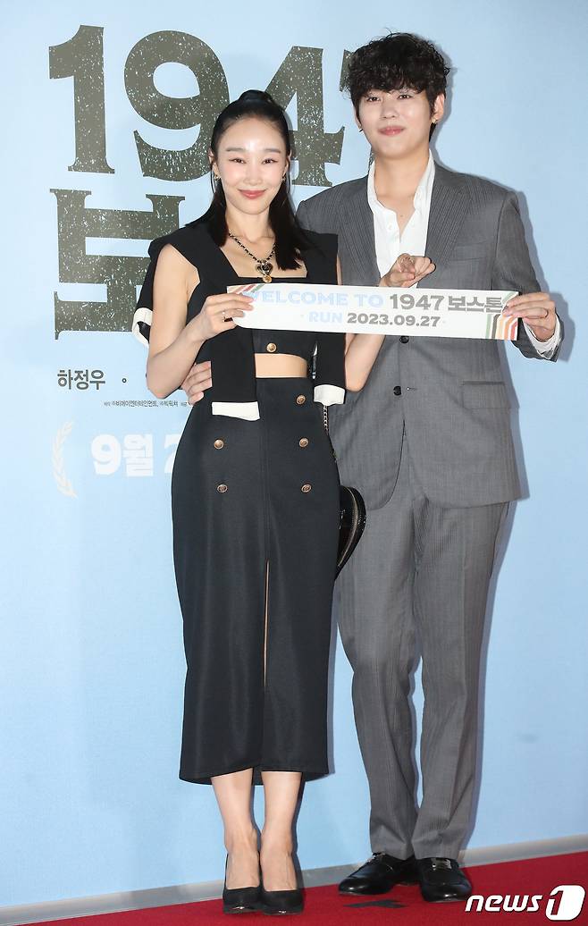(서울=뉴스1) 권현진 기자 = 이사강 감독과 가수 론이 11일 서울 송파구 롯데시네마 월드타워점에서 열린 영화 '1947 보스톤‘(감독 강제규) VIP 시사회에서 포즈를 취하고 있다.