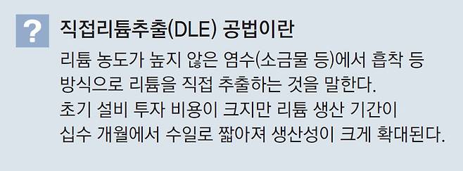 국내에선 포스코 외에 일부 중소기업들이 기술 개발에 나섰다. 국내 한 중소기업은 DLE 기술을 활용해 신안 앞바다의 리튬 염수에서 리튬을 뽑아내는 공정 개발을 진행 중이다. 업계 관계자는 “리튬 수요가 갈수록 커지는 상황에서 생산 기술 확보는 곧 무기 하나를 얻는 것”이라고 했다.