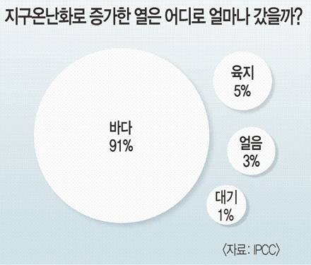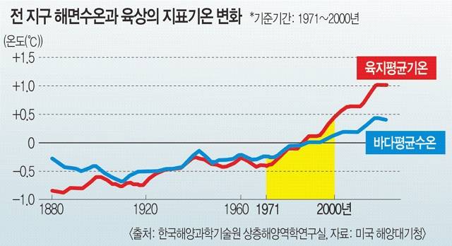 바다가 온실기체 등에 의해 증가한 열의 91% 정도를 흡수하고 있지만, 해면수온 상승은 육지 지표기온 상승의 절반 정도다. 즉 19세기 후반에 비해 현재 육지 지표기온은 1.9℃ 정도 상승한 데 비해 바다는 0.9℃ 상승했다. 따라서 지구 평균온도 상승은 지구의 71%가 바다로 덮여 있다는 것을 감안하면 1.2℃가 된다.