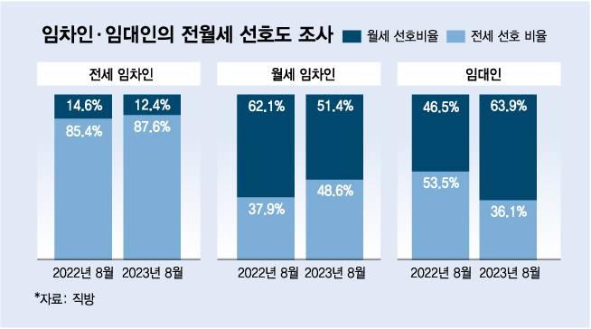 직방 관계자는 "2020년 조사 결과에 비하면 여전히 월세 선호 비율이 높고 전세사기 등 문제가 지속하고 있다"며 "임대차 보증금을 지키기 위한 대항력 확보 노력과 함께 임차인들의 불안감을 해소하기 위한 거래 시장 투명성, 안전성 확보 노력도 필요하다"고 말했다.