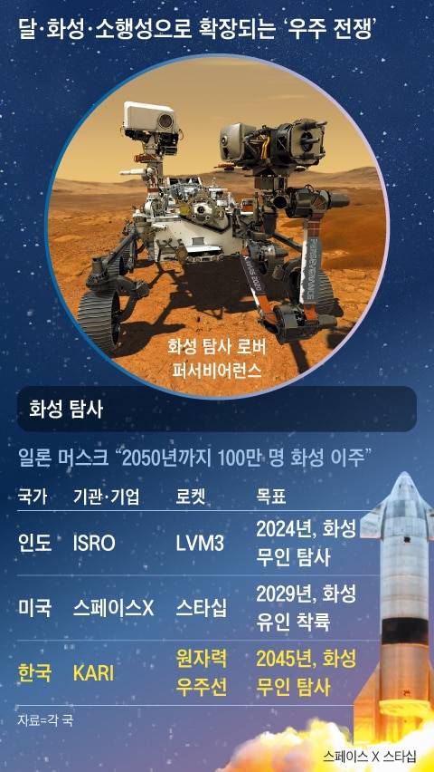 스페이스X는 한번 발사한 로켓을 재활용하는 방식으로 위성·탐사선 발사 비용을 30%가량 낮췄고 달 탐사와 민간 우주 여행도 동시에 추진하고 있다. 2000년대 초반 터무니없는 몽상이라 놀림받던 머스크의 화성 이주 계획은 점차 현실에 가까워지고 있다. 스페이스X의 혁신에 자극받은 중국·일본·유럽·한국도 수조원의 예산을 쏟아부어 달 넘어 심(深)우주 개척에 뛰어들기 시작했다. 세계 7번째로 자력 발사체·발사대·위성을 개발하는 데 성공한 후발 주자 한국에서도 스타트업들이 ‘제2의 스페이스X’를 꿈꾸고 있다. 세계 우주 시장은 지난 2020년 4240억달러(약 560조원)에서 오는 2040년에 1조달러까지 성장할 전망이다. 머스크가 촉발한 글로벌 로켓 경쟁이 ‘우주 전쟁’으로 확산되고 있는 것이다.