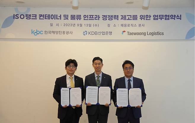 [13일 태웅로직스 본사에서 열린 'ISO 탱크 컨테이너 및 국내외 물류 인프라 경쟁력 제고를 위한 업무협약'에서 윤상호 해양진흥공사 사업운영본부장, 박종만 산업은행 해양산업금융본부장, 조용준 태웅로직스 사장(왼쪽부터)이 사진 촬영을 하고 있다. (사진=산업은행)]