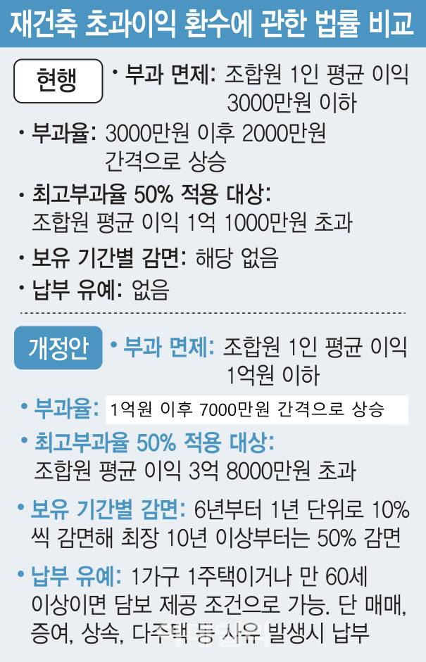 재초환법은 2006년 제정된 이래로 2017년까지 유예돼 사실상 식물 법안으로 존재해왔다. 2018년 법안이 시행되고 수억 원 단위의 부과금이 부과되자 과도한 제재라는 반발이 일었다. 윤석열 대통령이 재초환법 완화를 공약으로 내세우자 본격적인 법 개정 움직임이 뒤따랐다. 지난해 11월 국민의힘 소속 김정재 위원 등 의원 11명이 재초환법 개정안이 발의해 여야는 1년 가까이 논의를 이어왔다. 개정안은 △재건축부담금 면제 이익의 기준을 기존 7000만원에서 1억원으로 상향하고 △1세대 1주택자의 부담금은 최대 50% 감면하고 △60세 이상은 주택을 처분할 때까지 납부를 유예하는 내용 등을 골자로 한다.