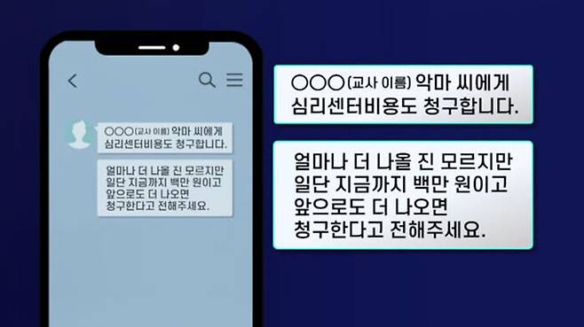 폭행 이후 B 씨는 사과는커녕, 교사 A 씨를 '악마'라고 칭하며 치료비 명목으로 100만 원을 보내라고 요구하기도 했습니다.