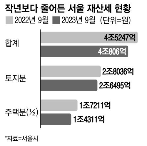 재산세는 매년 7월과 9월에 부과된다. 7월에 주택의 절반, 건축물 등에 대해 부과하고 9월에 나머지 주택 절반과 토지에 대해 세금을 매긴다. 이번 9월에 부과한 토지와 주택(1/2) 재산세는 작년 9월(4조 5247억 원)보다 9.8% 줄어든 4조 806억 원으로 집계됐다. 다만 재산세 부과 건수는 422만 건으로 전년 보다 3만 건 늘었다.