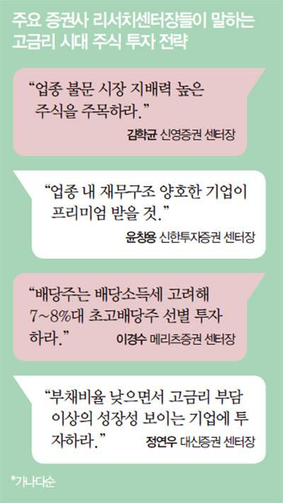 전문가들은 업종을 불문하고 시장 지배력이 높은 종목군의 강세를 예상한다. 김학균 신영증권 리서치센터장은 “15년 만에 찾아온 고금리 환경은 구조조정을 촉진해 대출금 이자조차 내지 못하는 이른바 ‘좀비 기업’들을 솎아 낼 전망”이라고 내다봤다. 이승훈 메리츠증권 애널리스트 역시 “압도적인 수익성과 성장성을 보이는 산업이거나 전통 산업 내에서도 독과점적인 지위로 성장하는 기업에 집중할 필요가 있다”고 강조했다.