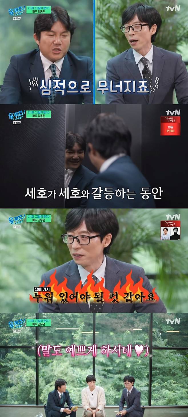 지난 주에 출연한 방탄소년단 뷔의 촬영을 마친 MC 유재석과 조세호는 강동원의 등장을 앞두고 "이런 라인업은 심적으로 무너진다"고 토로했다.