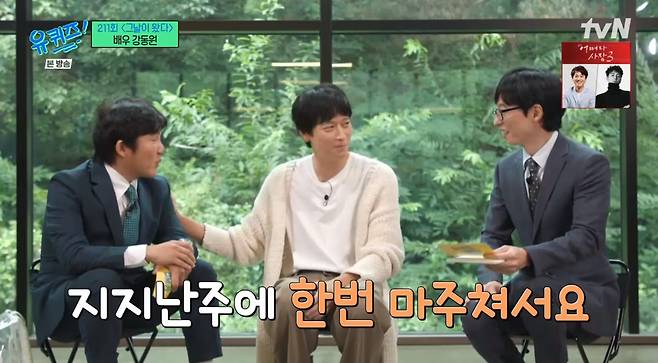 지난 주에 출연한 방탄소년단 뷔의 촬영을 마친 MC 유재석과 조세호는 강동원의 등장을 앞두고 "이런 라인업은 심적으로 무너진다"고 토로했다.