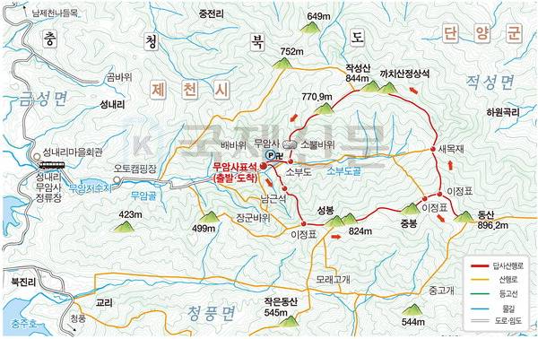 가을에 접어들면서 태풍이 연속으로 올라와 일기예보는 부산과 남부지방이 한동안 매일 비 소식이었다. 그래서 ‘근교산 &그 너머’ 취재팀은 기상정보를 보고 비가 오지 않는 지역을 찾았다. 백두대간인 죽령을 넘어서야 맑은 날씨여서 충북 제천 동산(東山·895.5m)~작성산(鵲城山·844.3m)을 산행지로 정하고 답사를 떠났다.