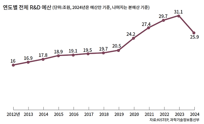 IMF 외환위기에도 깎인 적 없던 국가 연구개발(R&D) 예산이 대폭 삭감됐다. 8월22일 과학기술정보통신부(과기부)는 내년도 ‘주요 R&D 예산’을 전년 대비 3조4500억원 삭감한 21조5000억원으로 편성했다고 밝혔다. 국가 R&D 예산은 ‘주요 R&D’와 ‘일반 R&D’로 구분된다. 전체 R&D 예산 중 80% 이상을 차지하는 ‘주요 R&D’ 예산이 전년 대비 13.9% 줄어든 것이다.