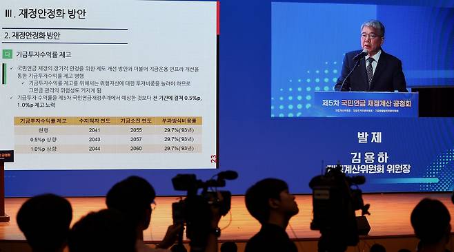 | ▲ 김용하 재정계산위원장이 1일 서울 강남구 코엑스에서 열린 국민연금 재정계산위원회 공청회에서 재정 안정화 방안에 대해 발표하고 있다 |
