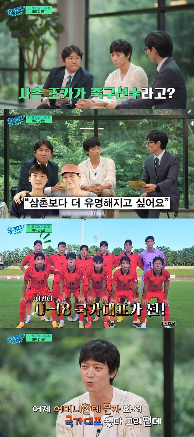 이어 FC서울 유소년 최준영 선수가 조카라는 질문에 강동원은 뒤늦게 "맞다"고 답했다. 의아한 반응에 MC들이 "처음 듣냐"고 묻자 "어제 어머니한테 문자와서 국가대표 됐다 그러던데"라고 답했다.