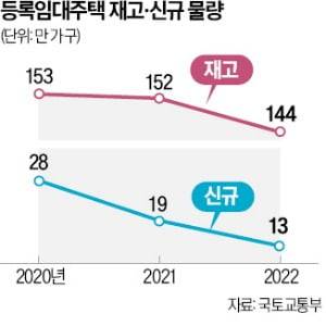 14일 국토교통부에 따르면 새로 신고한 등록임대주택 물량은 2018년 35만 가구에서 꾸준히 감소해 2020년 28만 가구, 2021년 19만 가구에 이어 지난해 13만 가구에 그쳤다. 올해 역시 신규 등록임대 물량이 크게 줄어 부동산업계에선 10만 가구를 밑돌 것으로 전망하고 있다. 재고 물량 역시 매년 크게 줄어 2018년 212만 가구에서 2020년 153만 가구, 2021년 152만 가구에 이어 지난해 144만 가구로 감소했다.
