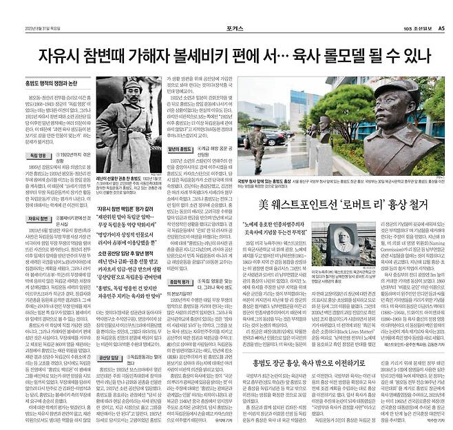 독립운동가 홍범도(1868~1943) 장군의 흉상을 육군사관학교에서 옮기는 문제로 논란이 일었습니다. ‘도대체 왜 그런 일을 하는가’라는 질문에 제대로 답변조차 하지 못하고 쩔쩔매는 국방부 대변인의 모습이 몹시 안타까웠습니다. 저는 지난 8월 31일자 조선일보 A5면 기사에서 이 문제를 다룬 적이 있습니다.(자유시 참변때 가해자 볼셰비키 편에 서… 홍범도, 육사 롤모델 될 수 있나https://www.chosun.com/culture-life/relion-academia/2023/08/31/6DWKVOZZAVEAPGFSLAXFSSJYOI/)