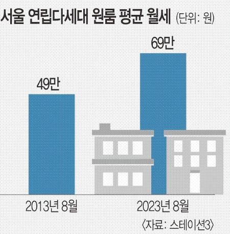 지난달 서울 연립다세대 원룸의 평균 월세는 2013년 8월 49만원과 비교해 10년 사이 42.2%(20만원) 상승했다.