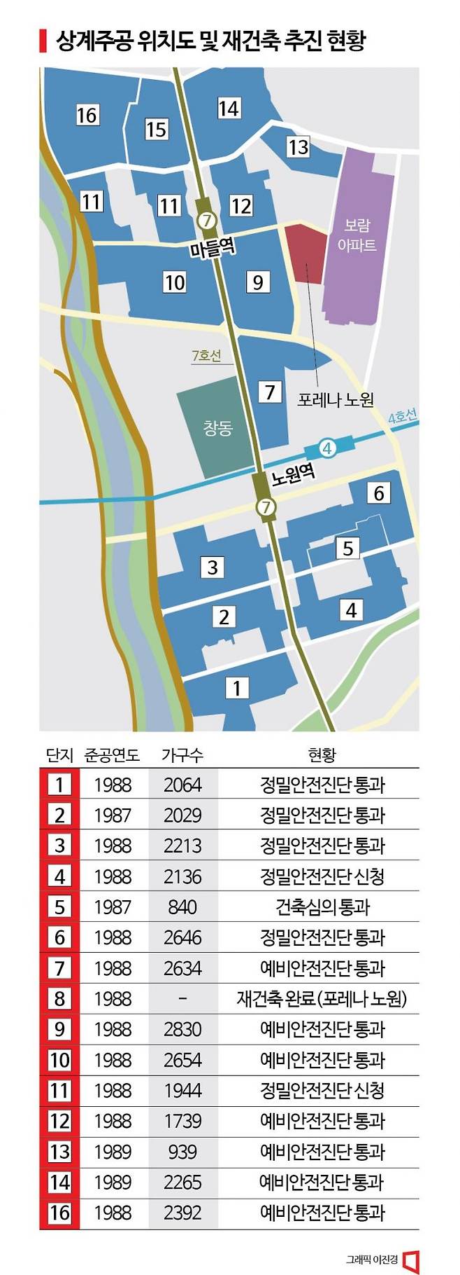 상계동은 양천구 목동과 같이 1980년대 대규모 주택공급을 위해 조성된 택지개발지구다. 이때 지어진 주공 아파트들은 대부분 재건축 연한인 30년을 훌쩍 넘긴 상태다. 8단지를 재건축한 포레나 노원은 이미 2020년 입주를 마쳤다.