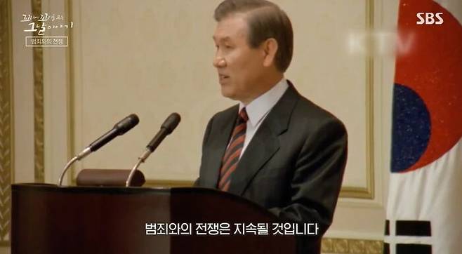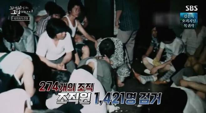 '범죄와의 전쟁'(10.13 특별선언), 노태우 대통령이 헌법에서 부여한 모든 권한을 동원해 폭력조직을 전면 소탕할 것을 선언한 거야. 동원된 경찰만 16,000여명. 2년간의 치열한 검거 끝에 274개의 조직, 조직원 1,421명이 검거됐어.