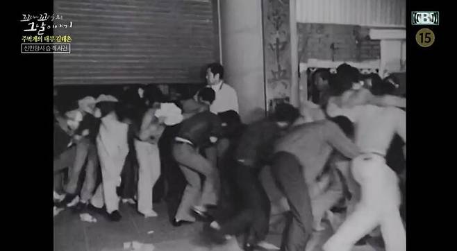 당시 제1야당이었던 신민당의 당사야. 김태촌의 명령에 쇠파이프, 각목으로 무장한 청년들이 함성을 지르며 건물로 뛰어 들어갔어. 이들은 유리창을 부수고 책상을 엎고 의자를 집어 던졌어. 사무실에 있던 국회의원들을 마구잡이로 때리기도 했어. 신고도 못하게 전화기도 부수고, 순식간에 정문 셔터까지 내렸어. 백주대낮에, 대한민국 제1야당 당사가 괴한들에게 점거된 거야.