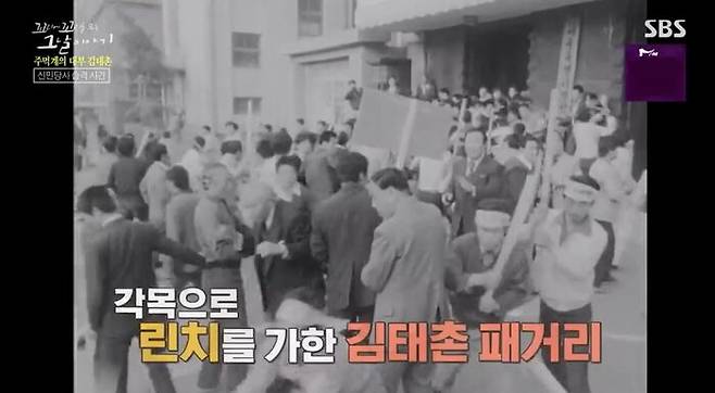 그런데 이 사건이 김태촌과 무슨 상관이었을까? 이날 패싸움을 벌인 맘보파가 바로, 서방파의 하부 조직 중 하나였거든. 맘보파의 배후로 김태촌의 이름이 보도되기 시작했어. 이 뉴스를 보고 눈이 번쩍 뜨인 한 사람, 바로 황 사장이었어. 황 사장은 병실로 기자들을 불러 인터뷰를 진행했어.