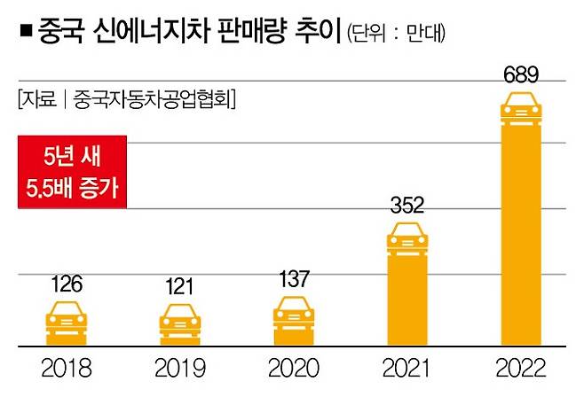 중국 정부의 전략은 적중했다. 테슬라의 폭발적인 성장과 함께 중국 신에너지차 시장도 커졌다. 2018년 17억5715만 달러(약 2조3476억원)였던 테슬라의 중국 매출은 2022년 181억5000만 달러(약 24조2484억원)로 5년 새 932.9% 늘었다. 같은 기간 126만대였던 중국의 신에너지차 판매량은 2022년 689만대로 5배 넘게 증가했다.
