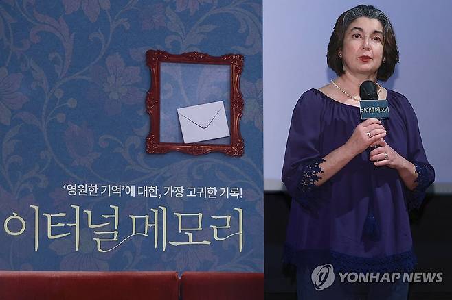 (서울=연합뉴스) 진연수 기자 = 배우 파울리나 우루티아가 15일 오후 서울 용산구 CGV용산아이파크몰에서 열린 영화 '이터널 메모리' 시사회에서 무대인사를 하고 있다. 2023.9.15