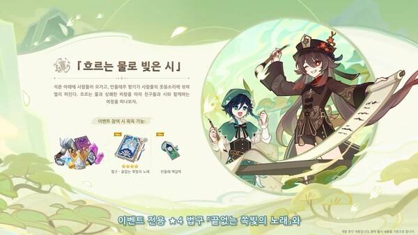 그림 복원은 촬영을 통해 누락된 풍경을 찾는 콘텐츠다. 힌트를 보고 그림 복원가를 도와 풍경을 촬영해 완성시키면 된다. 해당 콘텐츠들을 진행하면 '시 교류회 열기'를 모을 수 있다. 해당 재화로 이벤트 전용 4성 법구 '끝없는 쪽빛의 노래'와 함께 전용 재련 아이템 등 풍성한 보상을 받는다.