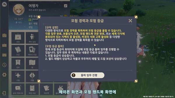 모험 등급 돌파 임무 알림 기능이 강화된다. 페이몬 화면과 모험 핸드북 화면에 관련 안내도 추가된다. 돌파 임무에서는 비경 클리어에 소요되는 시간을 줄이기 위해 일부 고난도 적이 삭제된다.