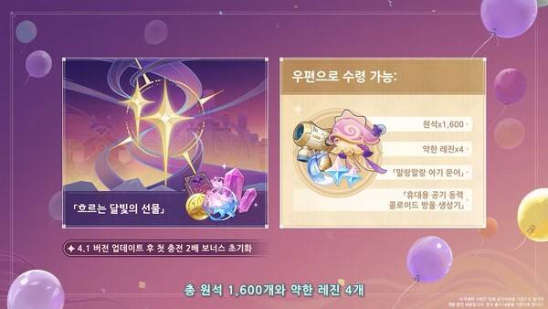 4.1 버전에서는 흐르는 달빛의 선물이라는 출석 체크 이벤트로 원석 1600개, 약한 레진 4개, 말랑말랑 아기문어, 휴대용 공기 동력 콜로이드 방울 생성기를 선물할 예정이다. 이와 함께 첫 충전 2배 보너스도 초기화된다.