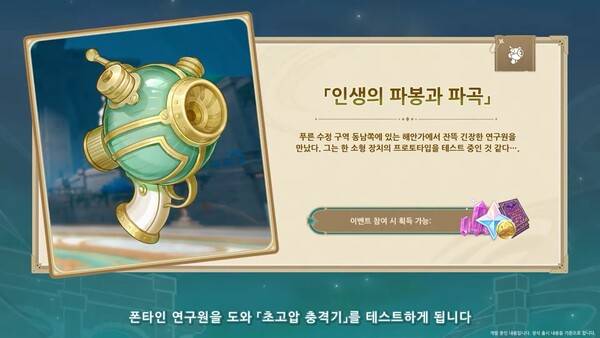 푸른 수정 구역 동남쪽 해안가에서는 도전 이벤트 '인생의 파봉과 파곡'을 체험할 수 있다. 여행자는 폰타인 연구원을 도와 초고압 충격기를 시험한다. 올바른 타이밍에 중갑 게이지를 정지시키면 초고압 충격기로 발동하는 초고압 충격파의 피해를 높여 적을 처치할 수 있다.