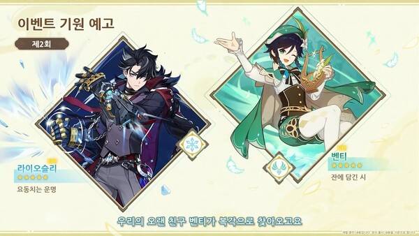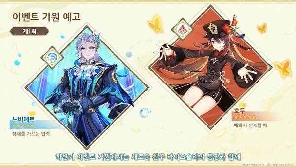 상반기에는 5성 캐릭터로 느비예트가 새롭게 추가되고 호두가 복각으로 등장한다. 하반기에는 라이오슬리가 추가되고 벤티가 복각으로 찾아온다. 호두와 벤티는 이벤트로도 등장할 예정이다.