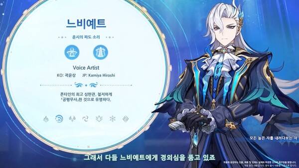 느비예트는 폰타인 최고 심판관으로 4.0 버전에서 이미 여행자와 만난 캐릭터다. 심판에서는 누구보다 공평무사하고 막강한 힘까지 보유했다. 그는 폰타인의 정의로운 심판 체계를 주관하며 공정의 원칙을 유지하려고 노력한다. 법정뿐만 아니라 일상 생활에서도 늘 대중에게 미칠 영향을 고려한다. 이를 위해 외부 교류도 자제한다.