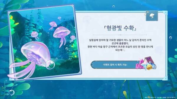 폰타인에서 원래 실험실에 있어야 할 기묘한 생물이 갑자기 수역 곳곳에 출몰하기 시작했다. 형광빛 수확 이벤트에서는 골머리를 앓고 있는 상인 키숀을 도와 폰타인 수역에 있는 보랏빛 형광 해파리를 회수해 생태계 문제를 해결하는 스토리가 펼쳐진다.